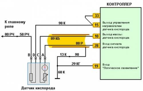Лямбда-зонд действует по принципу гальванического элемента с твердым электролитом в виде керамики из диоксида циркония. Керамика легирована оксидом иттрия, а поверх нее напылены токопроводящие пористые электроды из платины. Один из электродов «дышит» выхлопными газами, а второй – воздухом из атмосферы. Эффективное измерение остаточного кислорода в отработавших газах лямбда-зонд обеспечивает после разогрева до температуры 300 – 400оС. Только в таких условиях циркониевый электролит приобретает проводимость, а разница в количестве атмосферного кислорода и кислорода в выхлопной трубе ведет к появлению на электродах лямбда-зонда выходного напряжения. Датчик приобретает способность генерировать электрический сигнал только после прогрева до рабочей температуры не менее 360 градусов. Для ускорения прогрева датчики установлены в выпускном коллекторе двигателя, то есть в зоне максимально высокой температуры. Кроме того, каждый датчик имеет нагревательный элемент, управляемый контроллером. Отключение нагрева происходит при появлении на выходе датчика изменяющегося электрического сигнала, что свидетельствует о его прогреве.