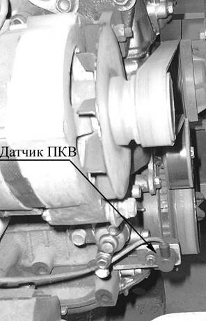 Отказ его приведет к остановке двигателя. ДПКВ позволяет точно определять момент подачи искрового разряда на свечи зажигания. Устроен датчик так – на стальной намагниченный сердечник надет капроновый каркас. Каркас полностью заполнен обмоткой из тонкого медного провода с эмалевой изоляцией. Для надежности обмотка герметизирована компаундной смолой. Принцип работы этого датчика основан на законе электромагнитной индукции. Когда мимо намагниченного сердечника проносится очередной зуб диска синхронизации на шкиве коленвала спереди двигателя, то в обмотке датчика генерируется импульс тока. Нормальная работа датчика может быть нарушена налипанием на магнитопровод металлических частиц, загрязнением зубчатого диска, увеличением зазора.