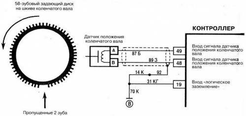 Датчик предназначен для формирования электрического импульсного сигнала, на основании которого контроллер определяет положение коленчатого вала относительно верхней мёртвой точки и частоту его вращения. По результатам измерения этих параметров контроллер формирует сигналы управления форсунками и системой зажигания, а также показаниями тахометра. Это единственный из всех датчиков, при неисправности которого работа двигателя невозможна. Конструктивно датчик представляет собой катушку с большим количеством витков провода, расположенную на магнитопроводе. На коленчатом валу двигателя расположен зубчатый диск, при вращении которого в катушке датчика создаётся импульсное напряжение. Зазор между магнитопроводом датчика и зубьями диска составляет 1 мм. Зазор регулируется за счет добавления прокладок между датчиком и посадочным гнездом. Также возможны сбои в работе из-за намагничивания диска синхронизации.