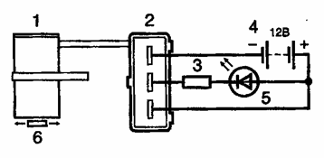 Разобравшись с теорией, приступаем к практической проверке. Прогреваем двигатель до устойчивых оборотов холостого хода. Снимаем с одной форсунки разъём жгута и подсоединяем к его контактам маломощную лампочку 12 В, 5 Вт. Допустимо заменить её на светодиод с резистором, как указано на схеме выше. Запускаем двигатель и наблюдаем за частотой моргания лампочки. Затем снимаем разъём с ДПРВ и сравниваем частоту с той, что была перед этим. Если она увеличилась в два раза, то датчик исправен (изменение частоты в два раза можно заметить на глаз). Если частота моргания лампы не изменилась, то датчик положения распредвала неисправен.
