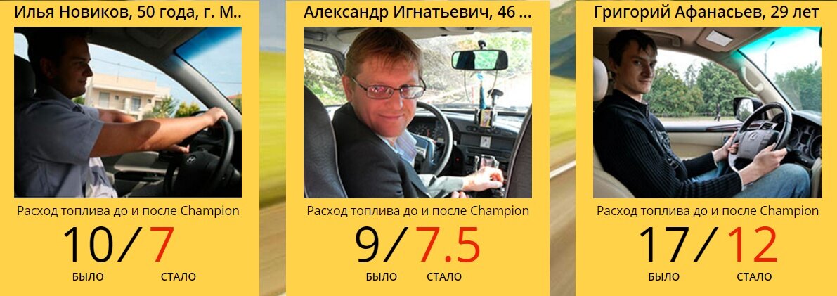 Полезная информация для всех автовладельцев - недавно был разработан Champion — универсальный ионный экономитель топлива. Представляет он из себя специальное средство, которое покрывает внутренность любого двигателя (бензин, дизель) и резко снижает трение, а следовательно износ ДВС и расход топлива. Использовать экономитель топлива Champion - один из лучших способов снизить количество потребляемого топлива и начать экономить по-настоящему. Для тех кто ещё не в курсе, экономайзер Champion — уникальная разработка, способная в значительной мере снизить расход топлива автомобилем в среднем на 20%. Таким образом если раньше для того, чтобы проехать определённое расстояние требовалось 20 литров бензина, то с Champion нужно всего около 16 л.