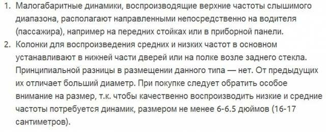 Профессионалы не рекомендуют приобретать динамики с размерами 10-13 сантиметров. Наиболее качественные считаются динамики с размерами 16-17 сантиметров. Именно такие динамики отлично воспроизводят звуки на низких частотах. А для воспроизведения высококачественных частот используются динамики с небольшим диаметром.