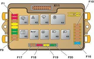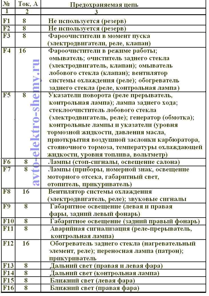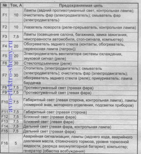 F16 (15 А) Указатели поворота, реле-прерыватель указателей поворота и аварийной сигнализации (в режиме указания поворота). Лампы света заднего хода. Реле контроля исправности ламп. Блок индикации бортовой системы контроля. Комбинация приборов. Контрольная лампа аварийного давления масла. Контрольная лампа стояночного тормоза. Контрольная лампа уровня тормозной жидкости. Контрольная лампа разряда аккумуляторной батареи. Маршрутный компьютер (или часы). Обмотка возбуждения генератора (в режиме пуска двигателя).