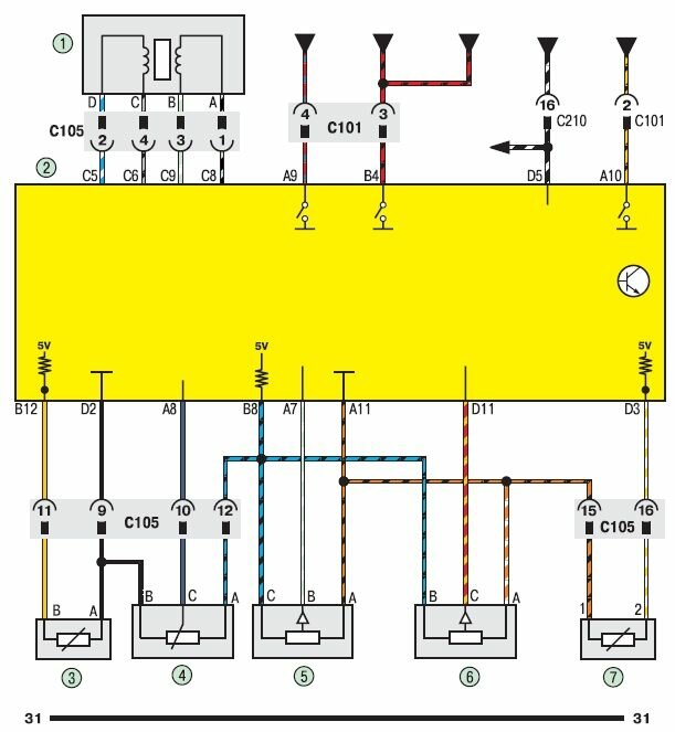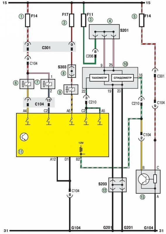 1, 2, 5 - предохранители (15 А); 3 - предохранитель (10 А); 4, 12 - соединительные колодки; 6 - электромагнитный клапан рециркуляции отработавших газов; 7 - двухходовой клапан; 8 - соединительная колодка; 9 - гравитационный клапан; 10 - комбинация приборов; 11 - электронный блок управления двигателем; 13 - датчик скорости автомобиля дэу.