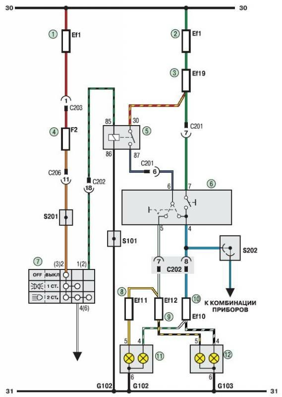1, 2 - плавкие вставки (80 А); 3 - плавкая вставка (25 А); 4, 8, 9 - предохранители (10 А); 5 - реле противотуманных фар; 6 - переключатель указателей поворота и света фар; 7 - переключатель наружного освещения; 10 - плавкая вставка (20 А); 11 - фара левая; 12 - фара правая.