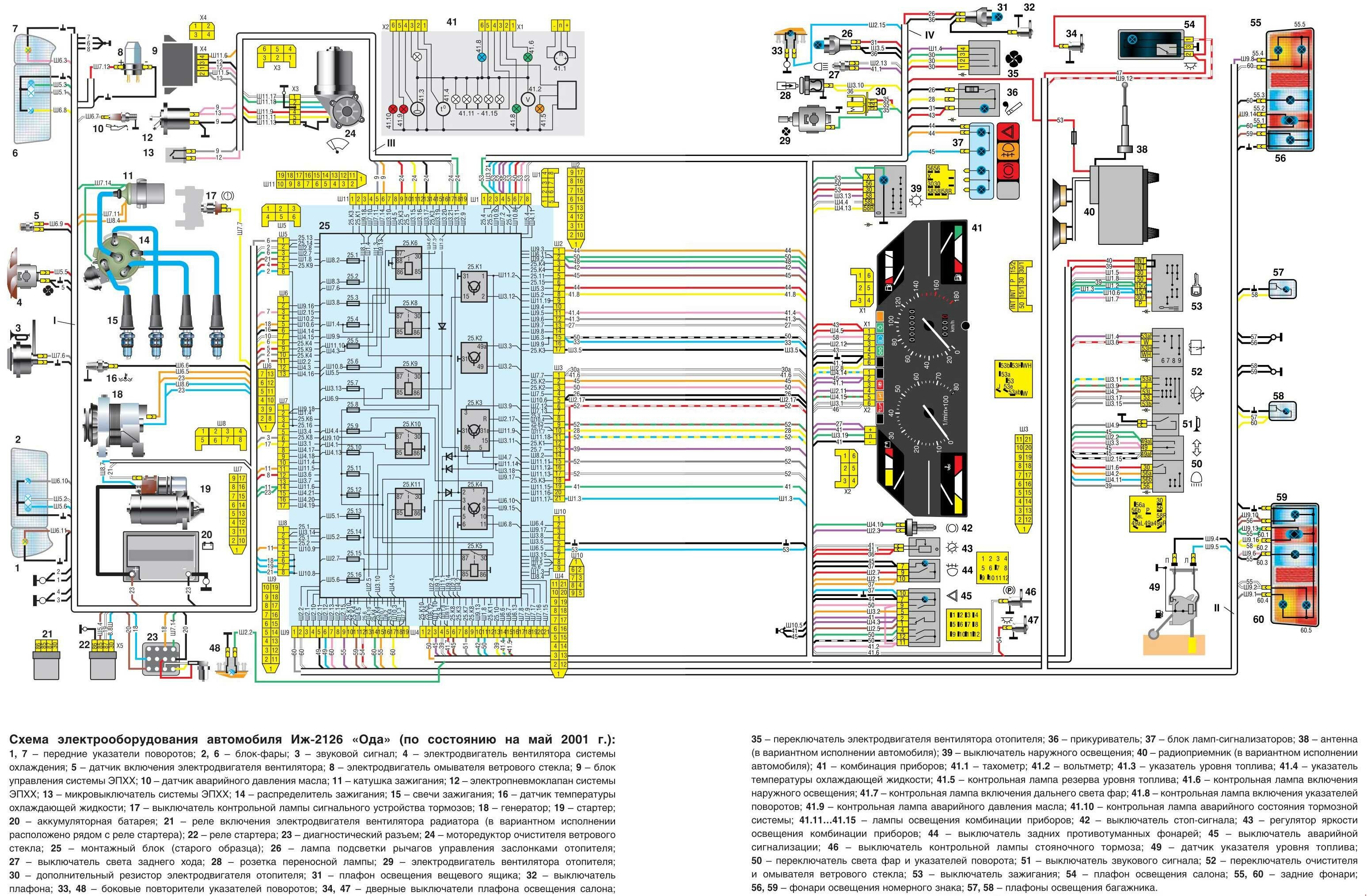 Цветные схемы с электрооборудованием отечественного легкового автомобиля ИЖ 2126 "Ода". Проводка ИЖ 2126 выполнена по однопроводной схеме: отрицательные выводы источников и потребителей электроэнергии соединены с «массой». При неработающем двигателе псе потребители питаются от аккумуляторной батареи, а после пуска двигателя — от генератора переменного тока со встроенным выпрямителем и электронным регулятором напряжения. При работе генератора аккумуляторная батарея заряжается. Основные электрические цепи защищена плавкими предохранителями, установленными в монтажном блоке. Номинал предохранителя и защищаемую им цепь можно определить по таблицам (для монтажных блоков старого и нового образца). Электродвигатель моторедуктора очистителя ветрового стекла зашищен автоматическим биметаллическим предохранителем многоразового действия. Предохранители отсутствуют в цепях зажигания, стартера, заряда аккумуляторной батареи.
