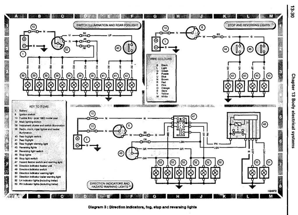 Приведены схемы электрооборудования автомобиля Land Rover Discovery I 1993 года выпуска. Схемы чёрно-белые в не очень хорошем качестве, но этого достаточно для самостоятельного небольшого ремонта неисправностей электрической части авто. Все обозначения на английском языке - воспользуйтесь любым переводчиком.