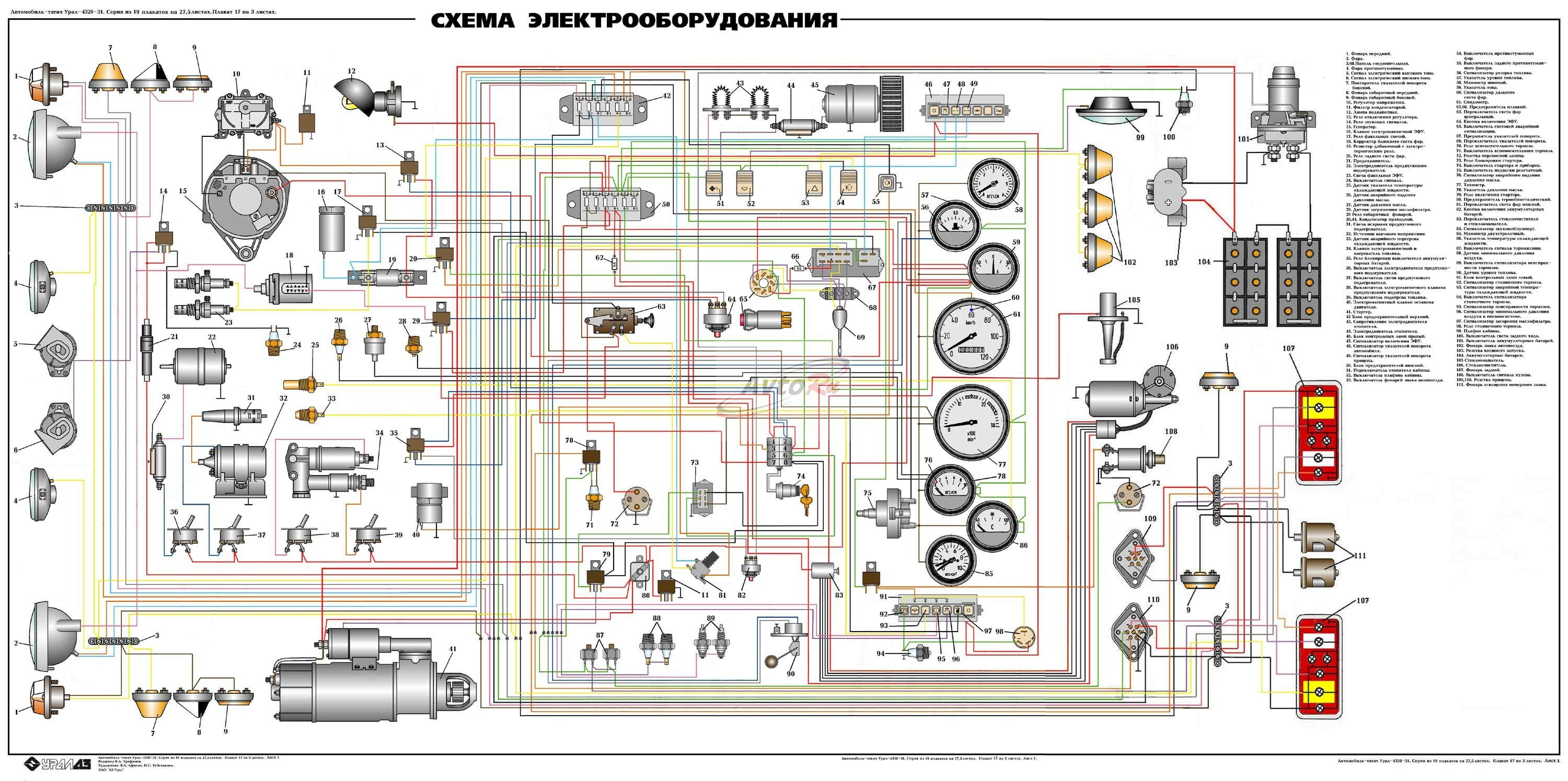 Приводятся электросхемы основных типов грузового автомобиля УРАЛ - 4, 5 и 6 серии. Справочная информация предназначена для проведения ремонта и обслуживания авто. Показаны на схемах фары, двигатель, генератор, реле и предохранители, датчики и выключатели, а также другие узлы грузовика УРАЛ. Вы можете при необходимости бесплатно скачать все схемы с сайта Electroshemi.ru просто перетащив их мышкой в свою папку. После чего увеличить на весь экран и подробно изучить.