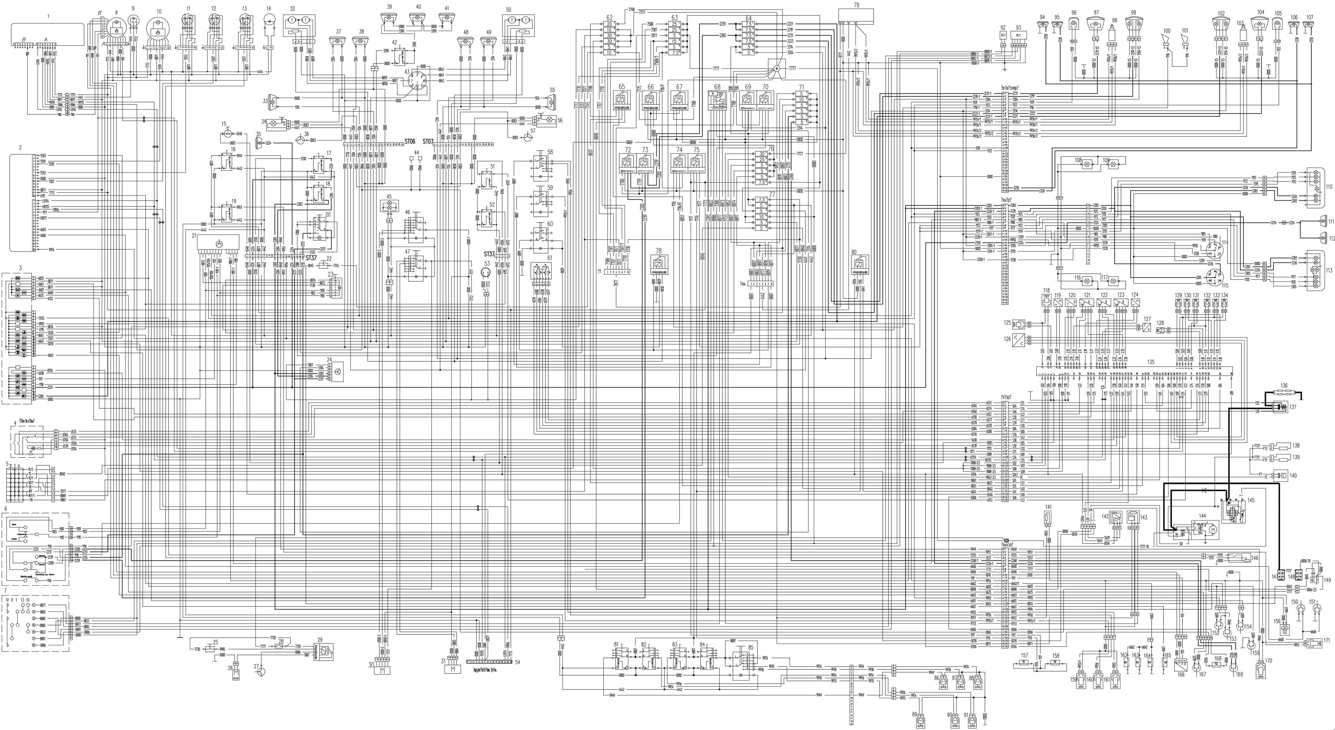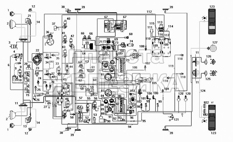 1-реле разгрузки клеммы «15» (Р2); 2-реле стартера (Р1); 3, 4, 6, 8, 9, 11-блоки предохранителей; 5-реле разгрузки клеммы «15» (R3); 7-реле стеклоочистителя (R4); 10-реле задних противотуманных огней; 12-разъем диагностики; 13-реле выключателя пневматического сигнала торможения (R12); 14-реле обогрева зеркал (R11); 15-реле сигнала стоп (R10); 16-реле звуковых сигналов (R9); 17-реле дальнего света (R8); 18-реле ближнего света (R7); 19-реле габаритных огней (R6); 20-реле дополнительное задних противотуманных огней (R5).