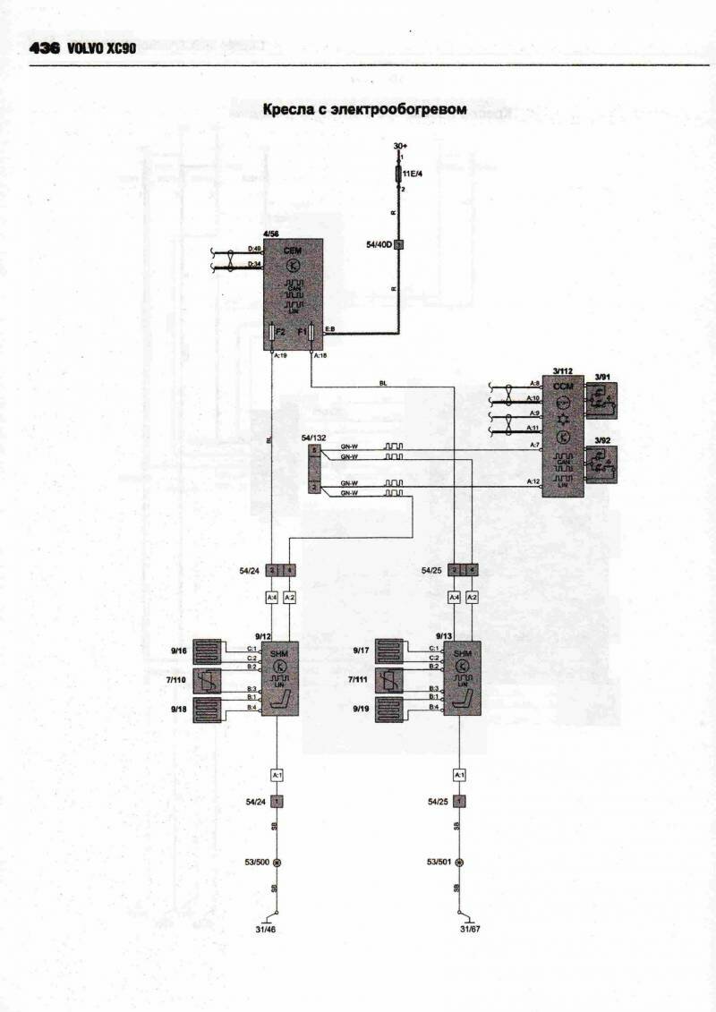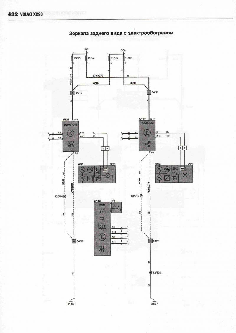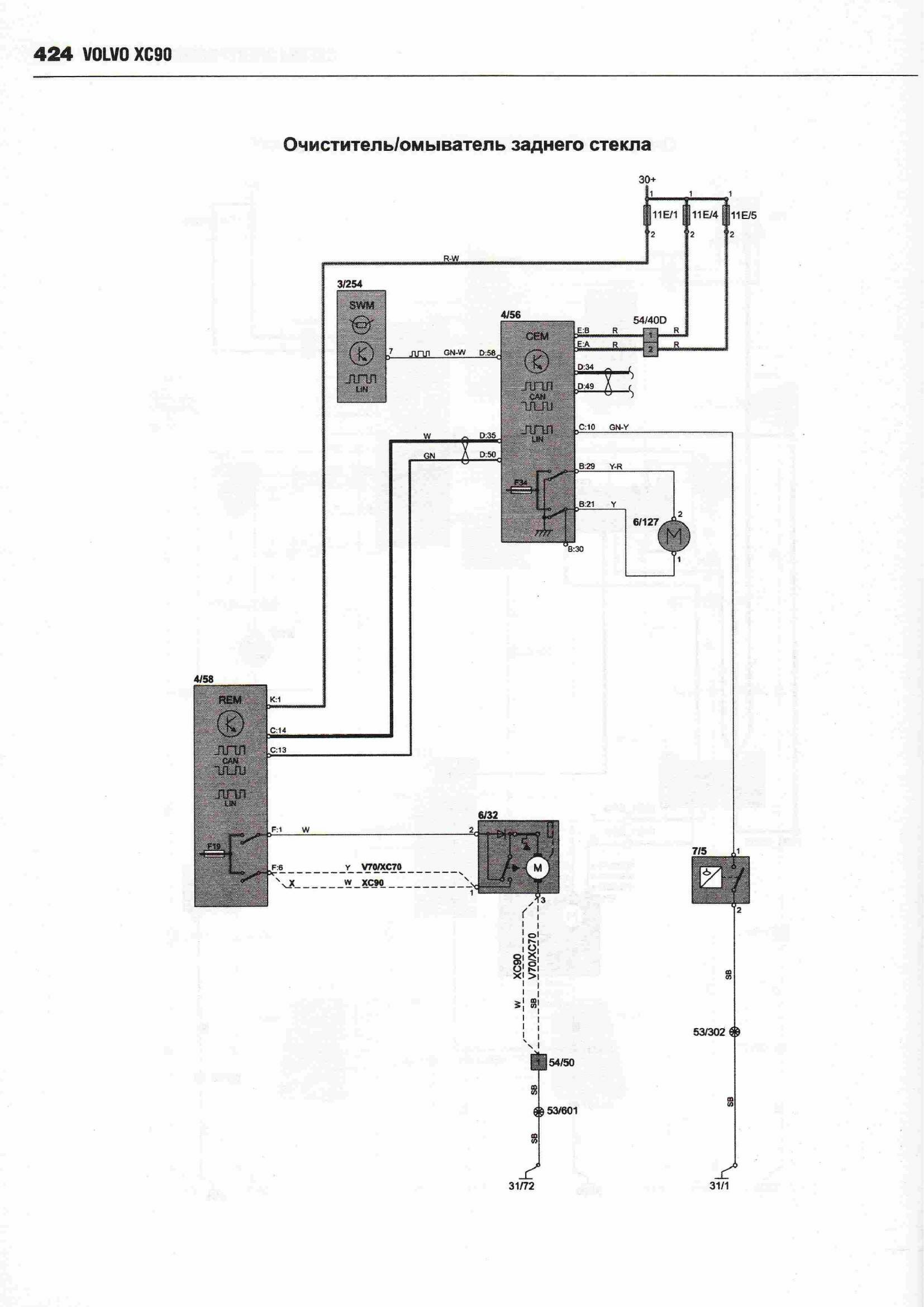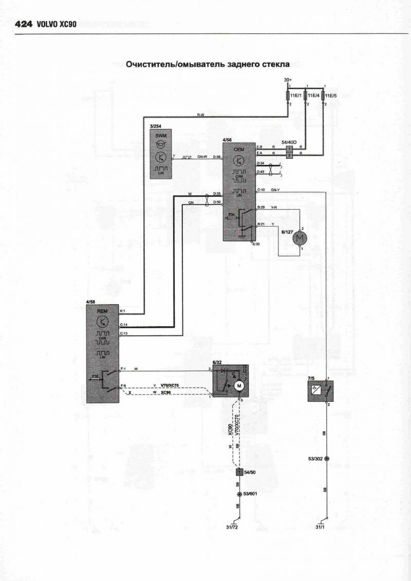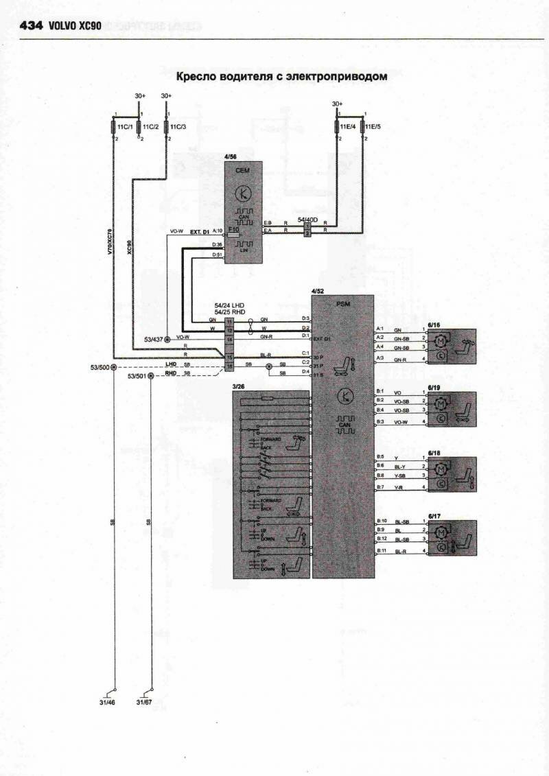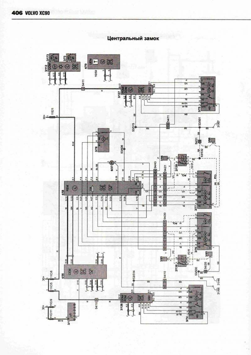Принципиальные схемы электрооборудования автомобиля ВОЛЬВО ХС 90 с 2002 (двигатели типов бензин 2,5, 2,9, 3,2, 4,4 л и дизель 2,4). Начало сборника схем данного авто находится здесь. А тут вы можете посмотреть схемы фар и блока предохранителей. В Volvo 90 были разработаны активные биксеноновые фары, способные следовать направлению поворота автомобиля. Такие фары значительно повышают видимость в темное время. Процессор получает данные о различных параметрах движения автомобиля, проводит их анализ и настраивает систему для оптимального освещения дороги. Фары могут поворачиваться под углом до 15 градусов в каждом направлении, таким образом, общий диапазон поворота составляет 30 градусов. Это позволяет лучше и дальше освещать дорогу. Во избежание износа системы в дневное время функция поворота фар автоматически отключается. Ещё предлагается установка камеры для облегчения парковки. Это устройство, цель которого предотвратить наезд на людей при движении задним ходом и облегчить процесс парковки. Камера с большим углом охвата показывает зону сзади автомобиля. Причем система не только позволяет водителю видеть, что происходит сзади автомобиля, но она еще показывает планируемую траекторию движения задним ходом. Изображение выводится на экран навигационной системы, размещенный поверх панели приборов. Угол поля изображения охватывает всю зону за автомобилем, при этом обеспечивается минимальное искажение изображения. На экран выводятся вспомогательные линии, которыми обозначен периметр предполагаемой парковки после завершения требуемых маневров. Эти линии изменяются в зависимости от вращения рулевого колеса, помогая водителю сделать правильный выбор. Камера полностью интегрирована с системами авто.