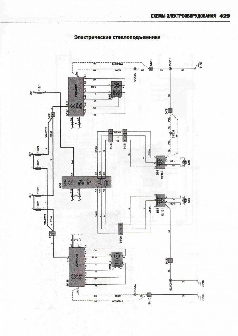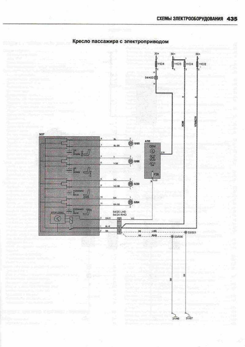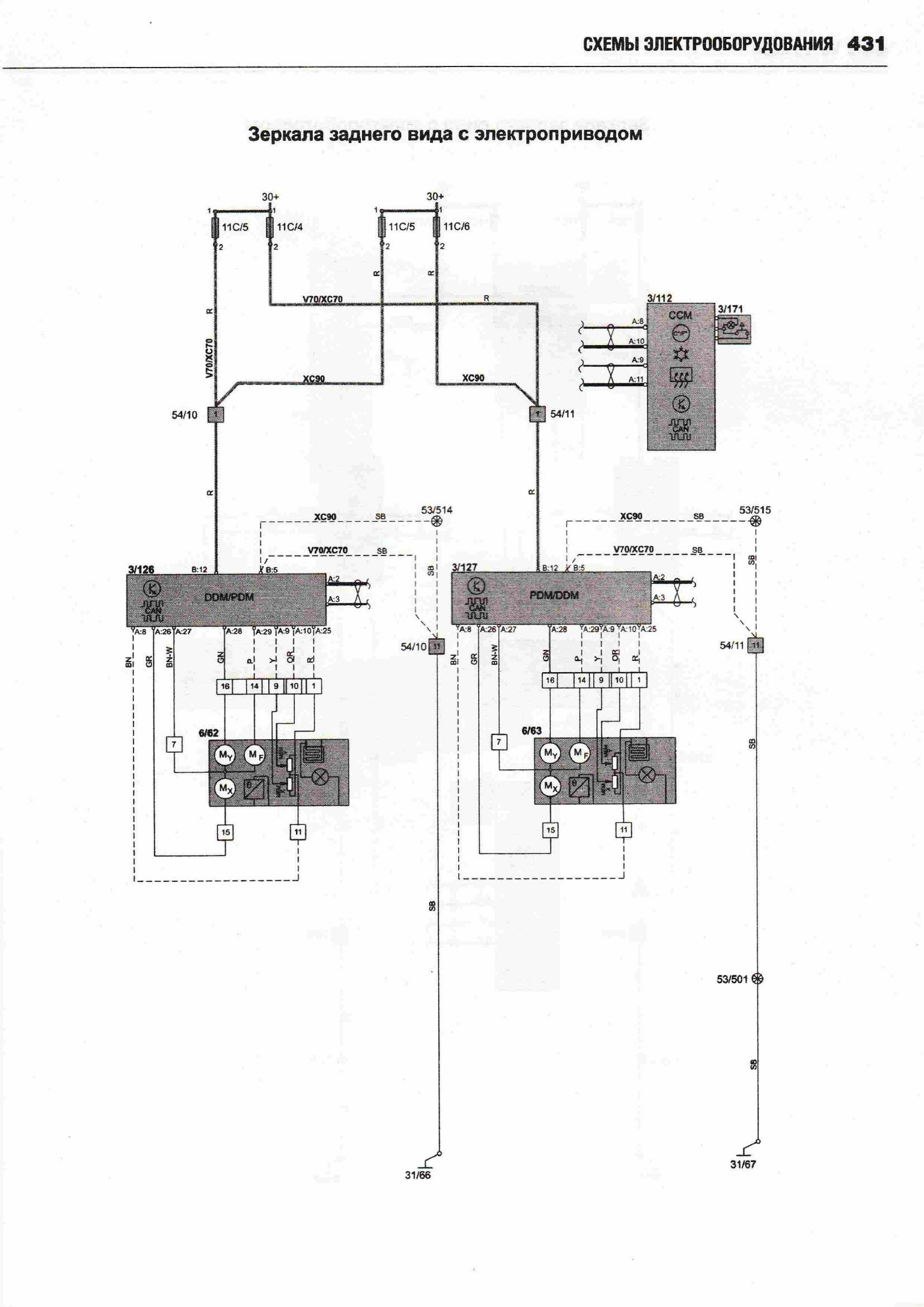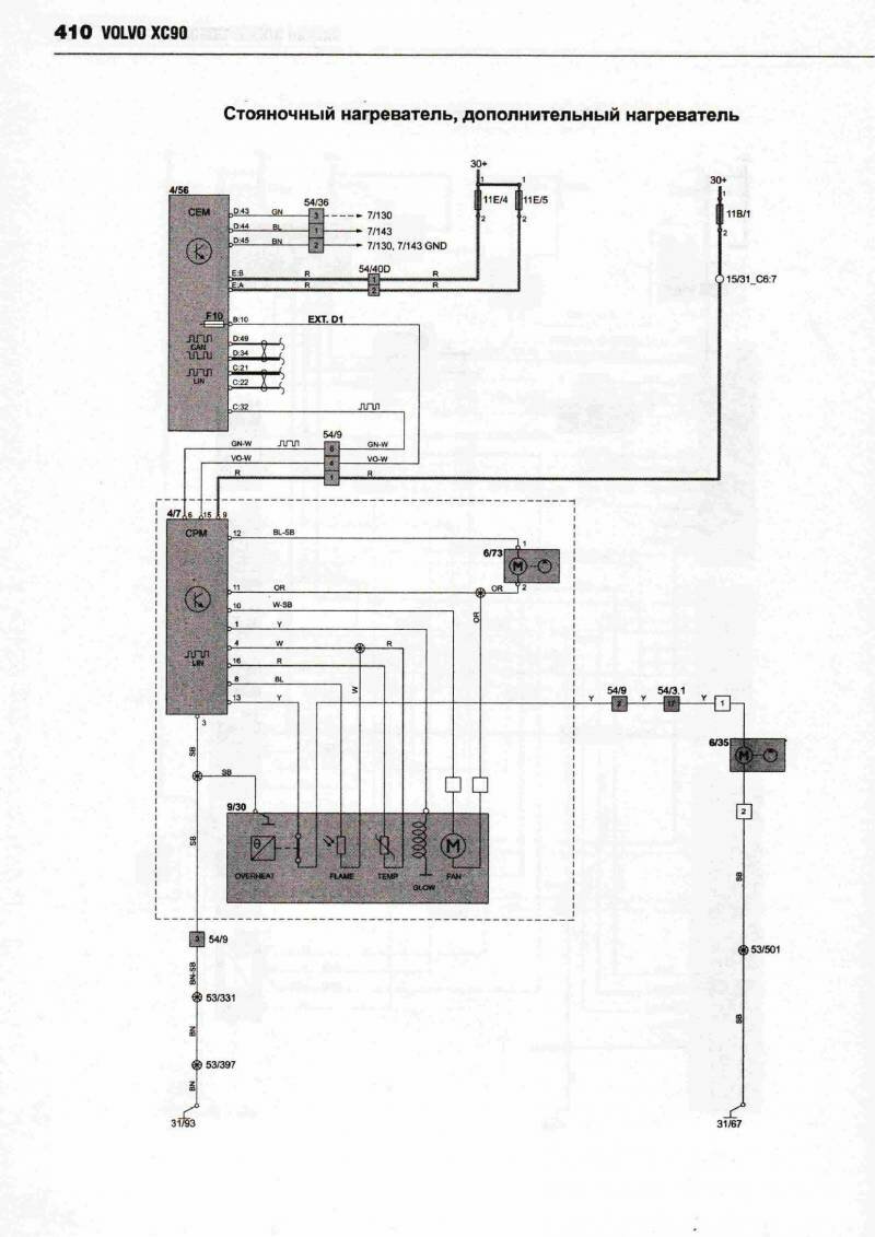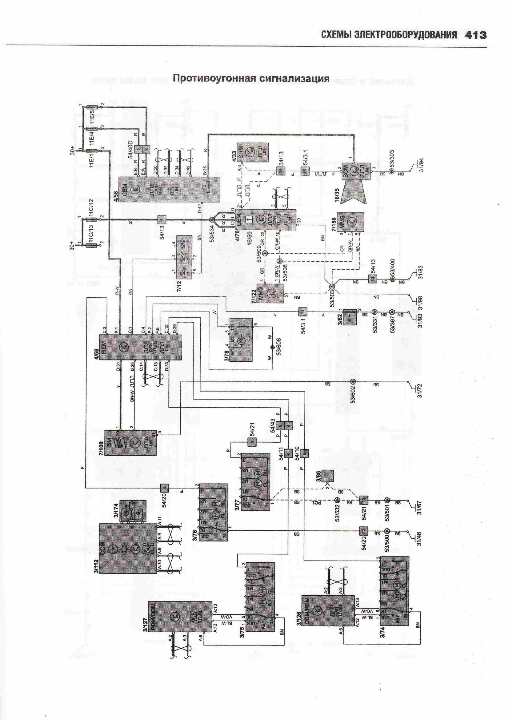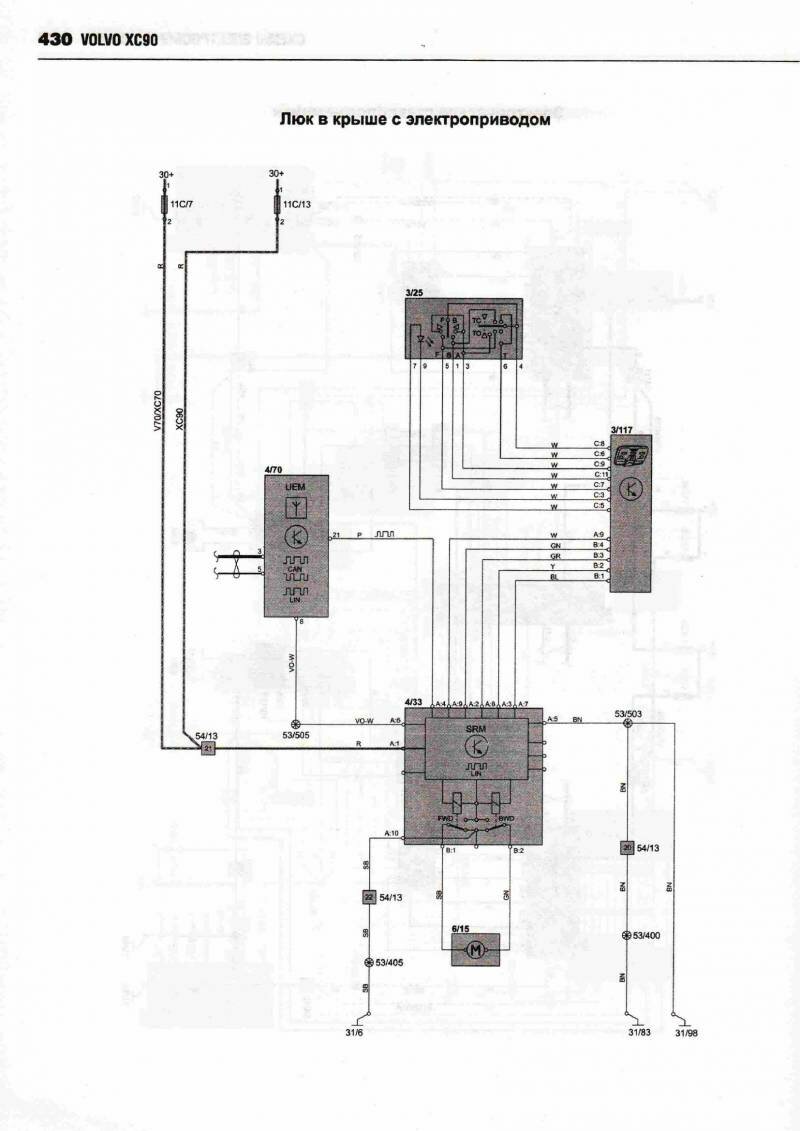 Принципиальные схемы электрооборудования автомобиля ВОЛЬВО ХС 90 с 2002 (двигатели типов бензин 2,5, 2,9, 3,2, 4,4 л и дизель 2,4). Начало сборника схем данного авто находится здесь. А тут вы можете посмотреть схемы фар и блока предохранителей. В Volvo 90 были разработаны активные биксеноновые фары, способные следовать направлению поворота автомобиля. Такие фары значительно повышают видимость в темное время. Процессор получает данные о различных параметрах движения автомобиля, проводит их анализ и настраивает систему для оптимального освещения дороги. Фары могут поворачиваться под углом до 15 градусов в каждом направлении, таким образом, общий диапазон поворота составляет 30 градусов. Это позволяет лучше и дальше освещать дорогу. Во избежание износа системы в дневное время функция поворота фар автоматически отключается. Ещё предлагается установка камеры для облегчения парковки. Это устройство, цель которого предотвратить наезд на людей при движении задним ходом и облегчить процесс парковки. Камера с большим углом охвата показывает зону сзади автомобиля. Причем система не только позволяет водителю видеть, что происходит сзади автомобиля, но она еще показывает планируемую траекторию движения задним ходом. Изображение выводится на экран навигационной системы, размещенный поверх панели приборов. Угол поля изображения охватывает всю зону за автомобилем, при этом обеспечивается минимальное искажение изображения. На экран выводятся вспомогательные линии, которыми обозначен периметр предполагаемой парковки после завершения требуемых маневров. Эти линии изменяются в зависимости от вращения рулевого колеса, помогая водителю сделать правильный выбор. Камера полностью интегрирована с системами авто.
