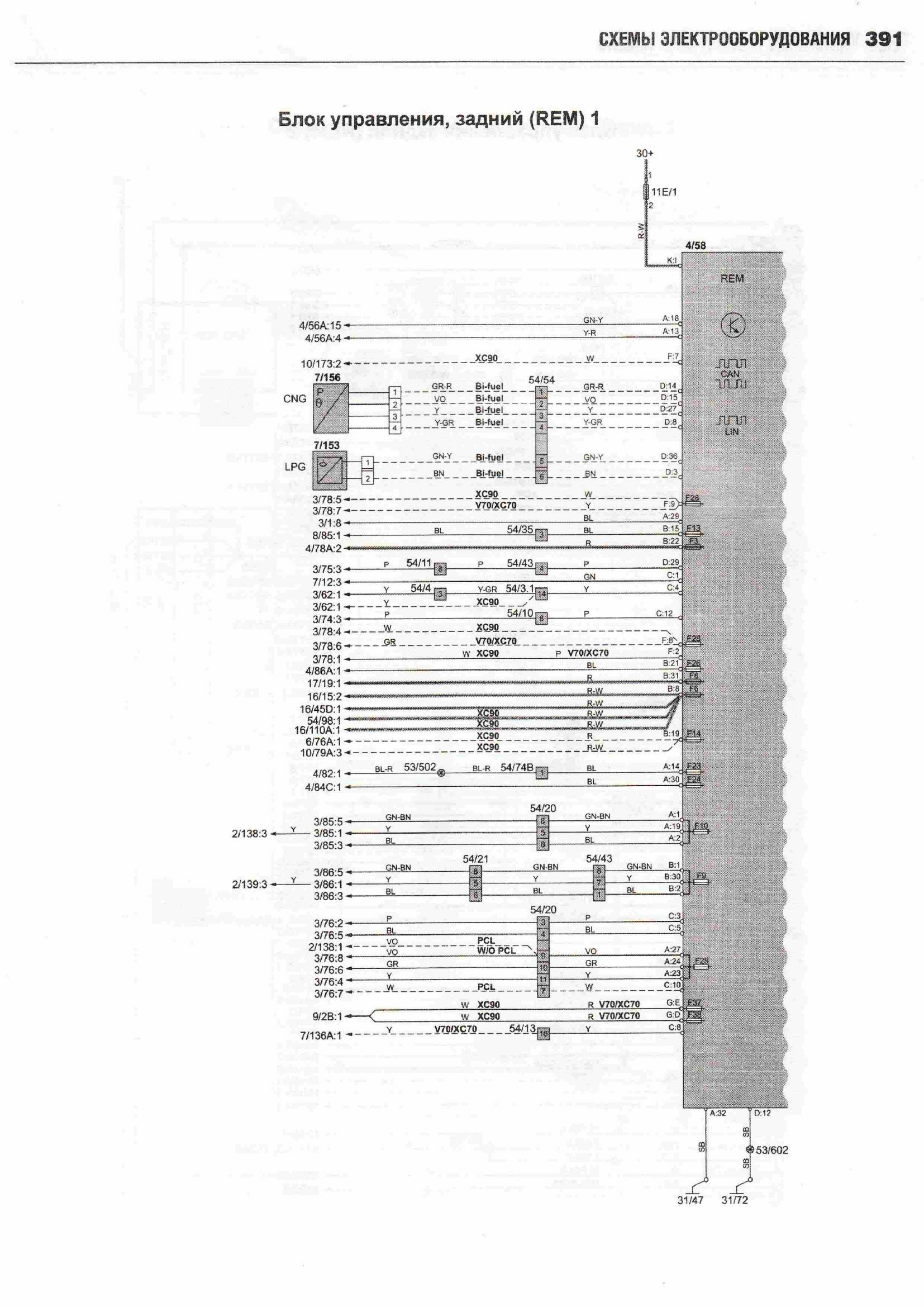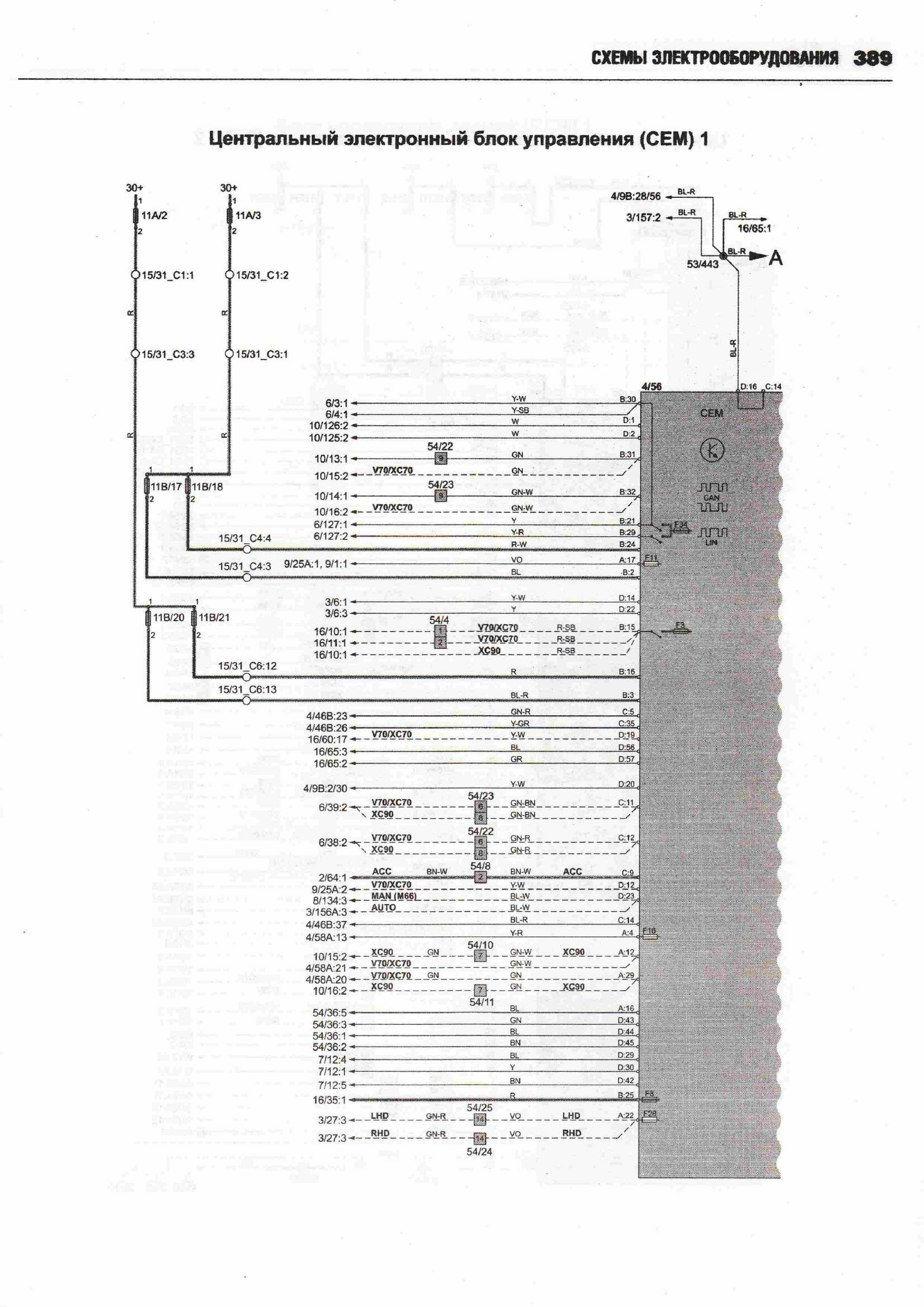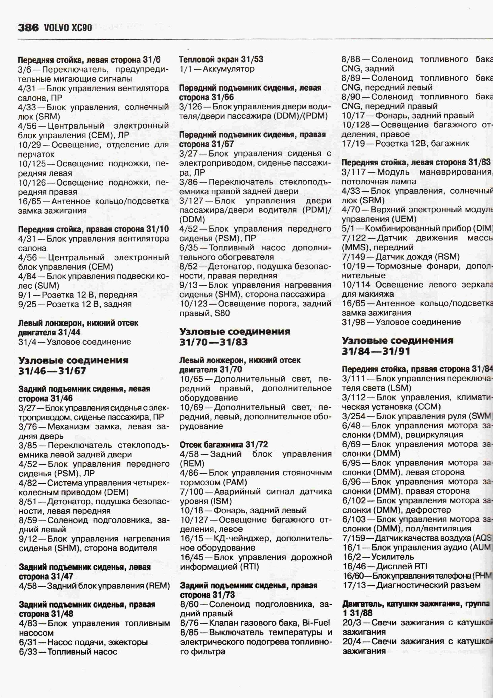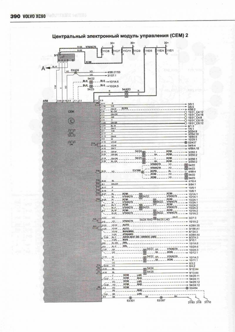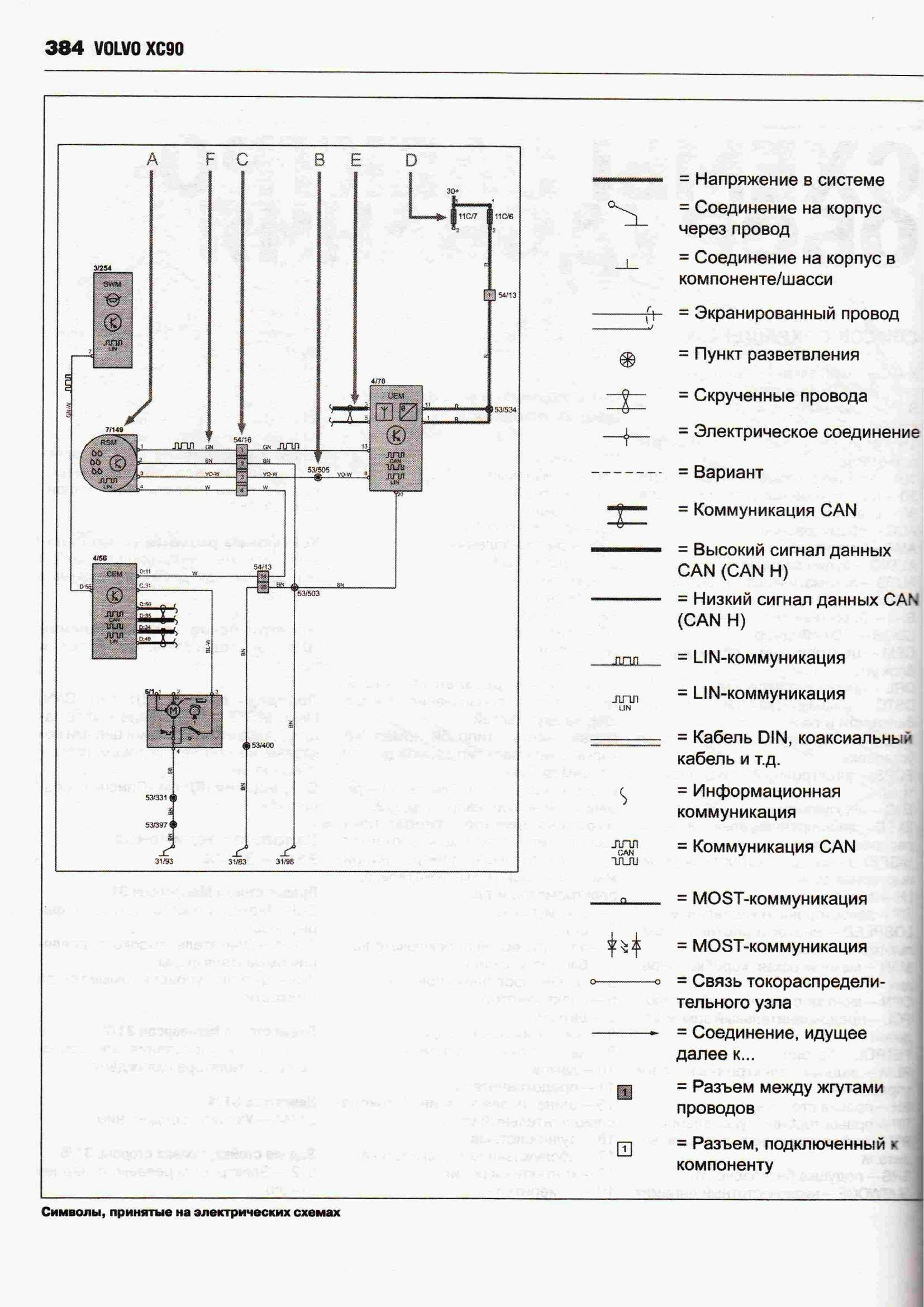 Принципиальные схемы электрооборудования автомобиля VOLVO XC90 с 2002 (двигатели типов бензин 2,5, 2,9, 3,2, 4,4 л и дизель 2,4). Продолжение сборника схем находится здесь. Volvo XC90 - это внедорожник, построенный по принципу пассажирского автомобиля. Он имеет несущий кузов, продуманную систему зон деформации, низкий центр тяжести и передовые системы безопасности, сводящие к минимуму возможность травм у водителя и пассажиров, вне зависимости от аварийной ситуации и силы столкновения. Более того, Volvo XC90 оборудован системой, предотвращающей опрокидывание автомобиля. Система RSC (система защиты от опрокидывания) включает гироскоп, который следит за перемещением автомобиля на дороге и фиксирует опасные моменты. Если система определяет, что риск опрокидывания действительно актуален, то обороты двигателя автоматически снижаются; затем, при необходимости, происходит притормаживание одного или более колес. Если же избежать опрокидывания не удается, то на помощь людям приходят системы безопасности - ремни безопасности с преднатяжителями и надуваемый занавес.