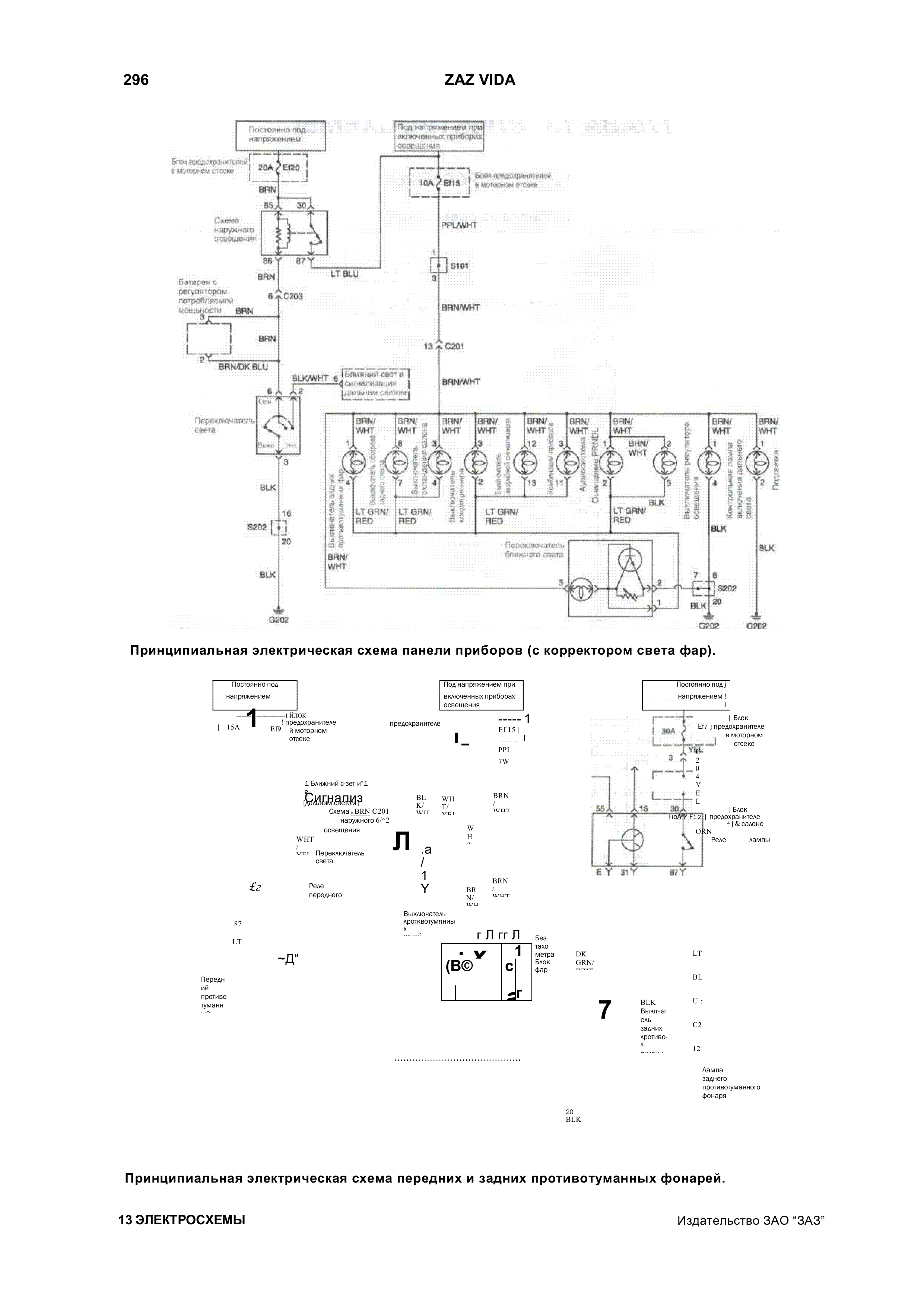 Сборник качественных схем автомобиля Zaz Vida взятых из инструкции по ремонту и эксплуатации. Имеются описания предохранителей,элементов схем и цвета проводников в электропроводке авто Заз Вида. Для увеличения - кликните на схеме.