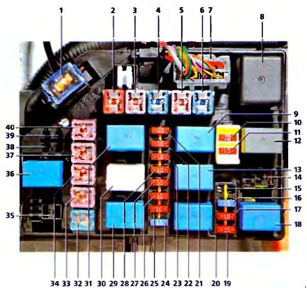 1 — предохранитель 100 А цепи генератора; 2 — предохранитель 50 А комплексный (цепей электропривода блокировки двери, аварийной сигнализации, сигналов торможения, обогрева заднего стекла, звукового сигнала, лампы освещения салона, ЭБУ); 3 — предохранитель 30 А цепи ламп головного и габаритного света; 4 — предохранитель 20 А цепи блока управления двигателем; 5 — предохранитель 30 А цепи пуска двигателя и катушек зажигания. 6 — предохранитель 20 Ампер цепи вентилятора радиатора системы охлаждения двигателя, 7 — разъем электропроводки, 8 — реле вентилятора отопителя. 9 — реле звукового сигнала, 10 — предохранитель 10 А цепи лампы освещения салона Хундай Акцент. 11 — предохранитель 10 А цепи головного устройства системы звуковоспроизведение. 12 — реле 2 вентилятора теплообменника конденсатора системы кондиционирования, 13 — реле муфты компрессора кондиционера, 14 — гнездо реле противотуманньх фар; 15 — резервное гнездо предохранителя; 16 — предохранитель 15 А регулятора холостого хода и датчика положения распределителного вала. 17 — предохранитель 10 А цепи блока управления двигателем. 18 — реле вентилятора радиатора системы охлаждения двигателя; 19 — предохранитель 10 А цепи включения кондиционера; 20 — реле 1 вентилятора теплообменника конденсатора системы кондиционирования; 21 — предохранитель 10 А цепи блока управления двигателем, 22 — предохранитель 10 А цепи муфты компрессора кондиционера, 23 — предохранитель 10 А цепи звукового сигнала; 24 — предохранитель 15 А цепи проти-вотуманных фар. 25 — предохранитель 10 А цепи правой лампы головного света. 26 — предохранитель 10 А цепи левой лампы головного света; 27 — предохранитель 10 А цепи ламп габаритного света правого борта автомобиля; 28 — предохранитель 10 А цепи ламп габаритного света левого борта автомобиля; 29 — реле ламп габаритного света; 30 — резистор предварительного возбуждения генератора; 31 — реле стартера Хундай Акцент, 32 — предохранитель 20 А цепи вентилятора теплообменника конденсатора сииемы киндицлимированин, 33 — предилранитель 30 А цепи электростеклоподъемников. 34 — предохранитель 30 А цепи блока управления АБС; 35 — гнездо реле постоянно включенного ближнего света; 36 — реле топливного насоса; 37 — предохранитель 30 А цепи блока управления АБС; 38,39 — гнездо диода; 40 — предохранитель 30 Ампер цепи вентилятора отопителя.