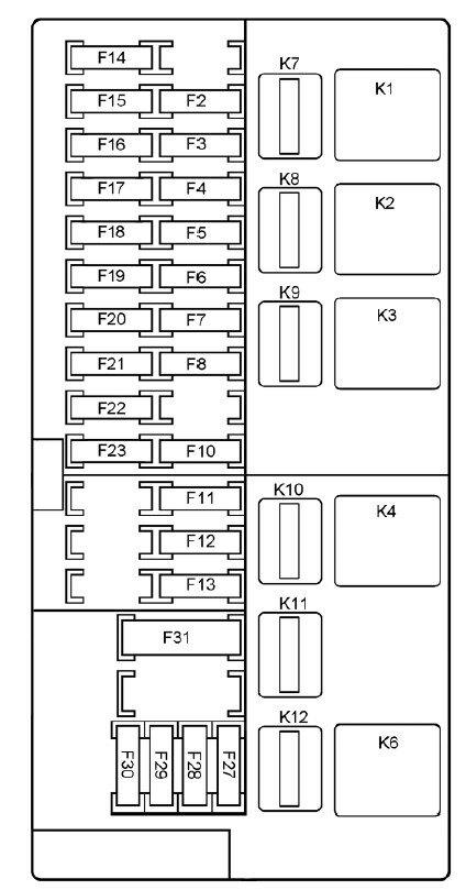 F3 (синий) 60 цепь питания электровентилятора системы охлаждения, звуковой сигнал, тревожный сигнал, замок зажигания, комбинация приборов, освещение салона, стоп-сигнал, прикуриватель