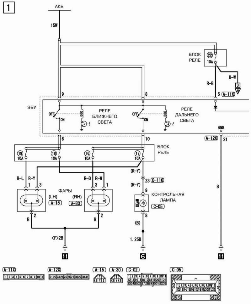 Схема подключения фар с реле дальнего и ближнего света