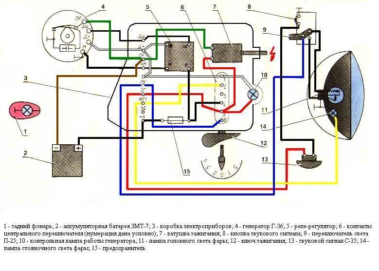 1 - фара ФГ 137Б2; 2 - лампа 12-45-40; 3, 4, 11, 12 - лампы А 12-1; 5 - звуковой сигнал С205Б; 6 - термореле включения электровентилятора 661.3710; 7 - электровентилятор; 8 - выключатель лампы "нейтраль"; 9 - лампа А 12-4; 10, 13 - лампа АМН 12-3-1; 14 - комбинированный переключатель (правый переключатель); 15 - выключатель ИЖВК 103; 16, 28, 32, 35, 39 - лампы А 12-21-3; 17, 29, 34, 38 - фонари -указатели поворота; 18 - датчик сигнализатора перегрева ТМ111; 19 - выключатель зажигания; 20, 23 - свечи зажигания; 21, 24 - свечные наконечники; 22, 25 - катушки зажигания; 26 - генератор ГП7; 27 - выпрямитель-регулятор напряжения БПВ14-10; 33 - лампа А 12-5; 30 - выключатель ИЖВК107; 31 - задний фонарь 111.3716; 36 - аккумуляторная батарея; 37 - предохранитель; 40 - переключатель сигнализации (левый переключатель); 41 - прерыватель указателей поворота.