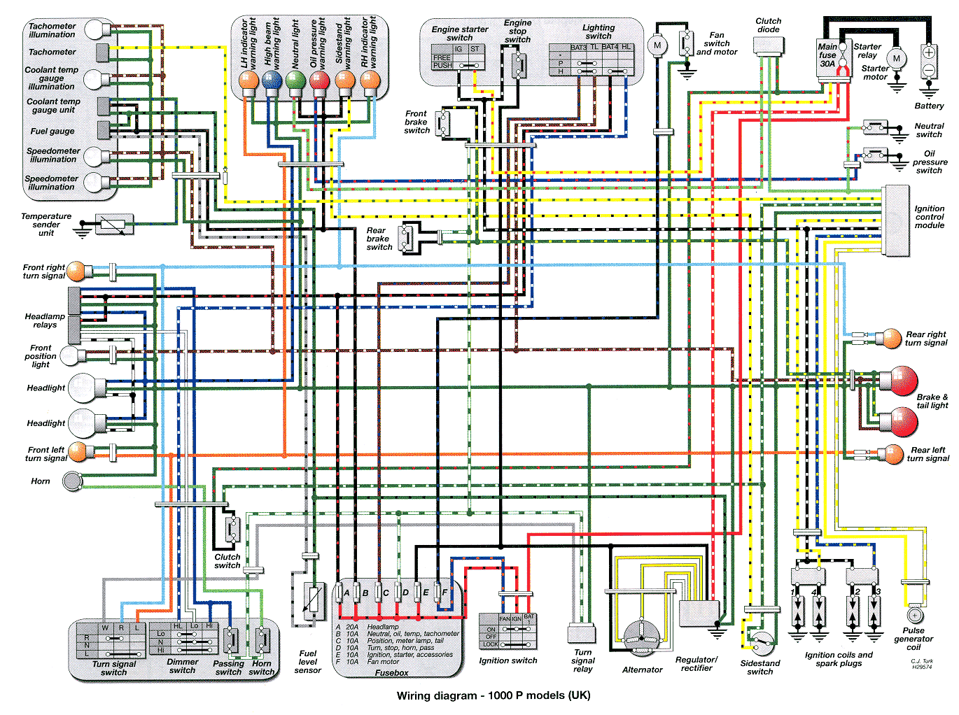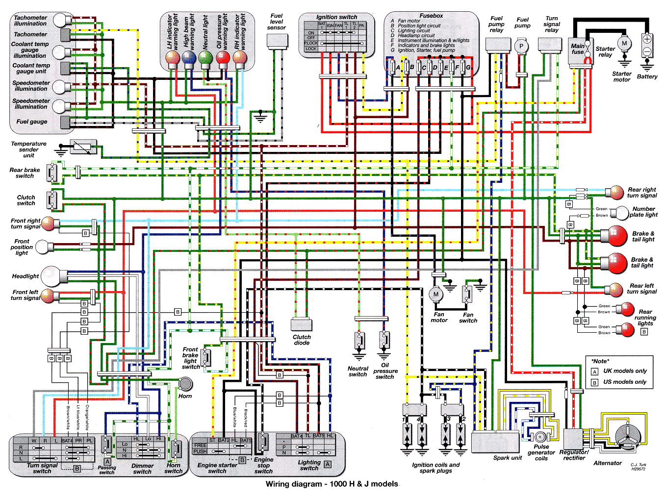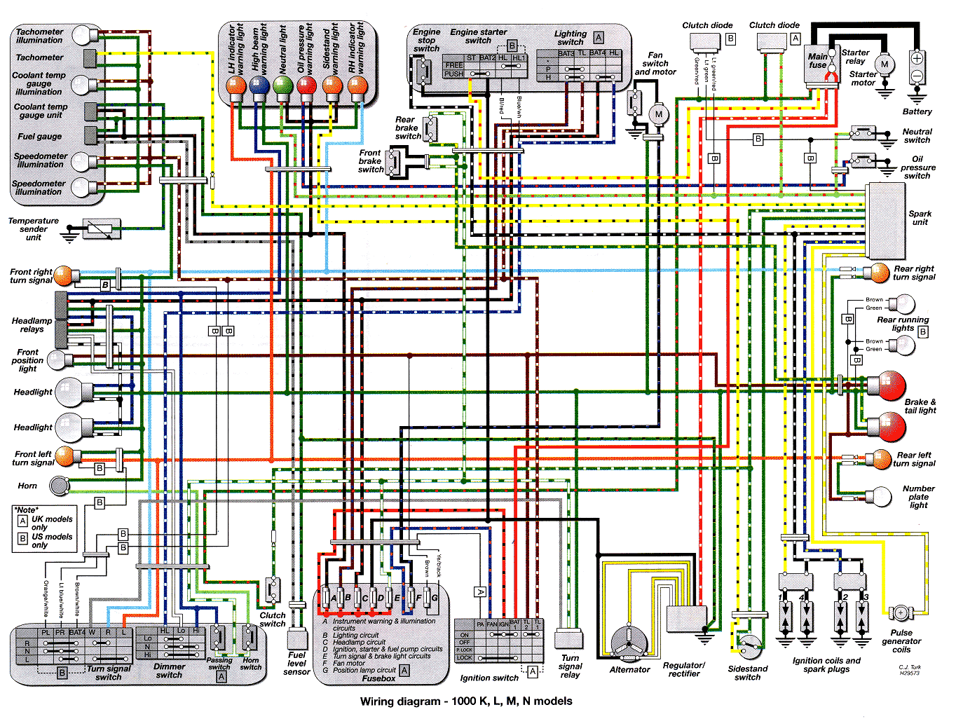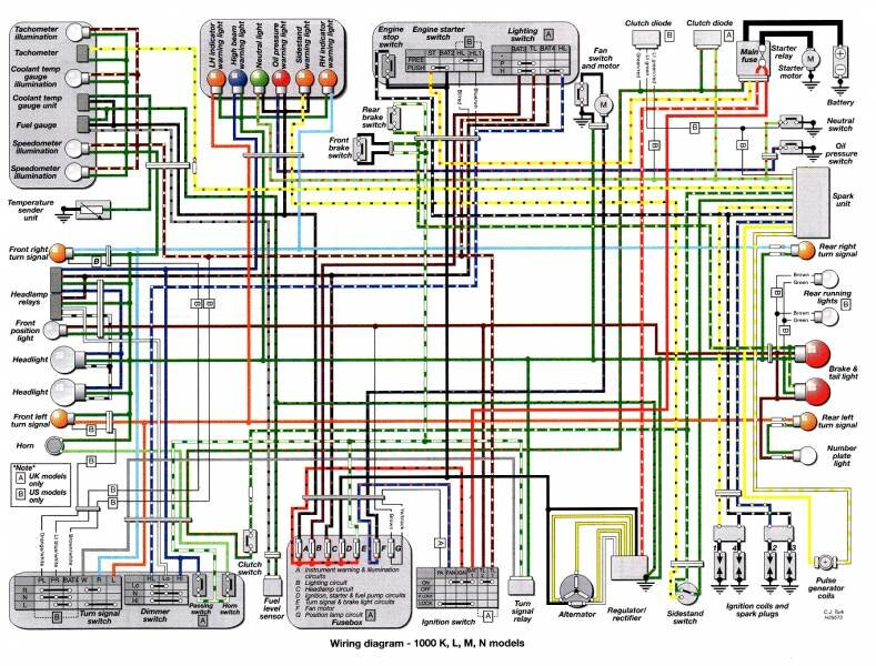 Представляем четыре электросхемы из мануала мотоциклов хонда из серии Honda CBR1000F. Все схемы в большом разрешении, цветные и качественные. Скачать на компьютер их можно кликнув по схеме и сохранив как изображение.