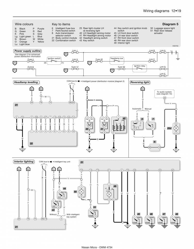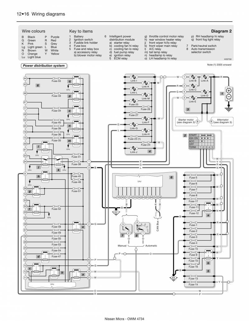 Электрическая система рассматриваемых в данной статье схем автомобия Nissan Micra, работает с напряжением 12 В. Соединение массы проходит через отрицательную клемму батареи. Батарея помещается в переднем левом углу двигательного отсека. Для запуска двигателя используется стартер, выключатель стартера является составной частью замка зажигания и предназначен для возбуждения установленного на стартере тягового реле. Встроенный в панель приборов индикатор заряда указывает на исправную работу электрооборудования, пока заряд батареи в норме. Принципиальные схемы в хорошем качестве и высокой чёткостью, но на английском языке. Дополнительная информация по электрооборудованию Ниссан Микра находится тут.