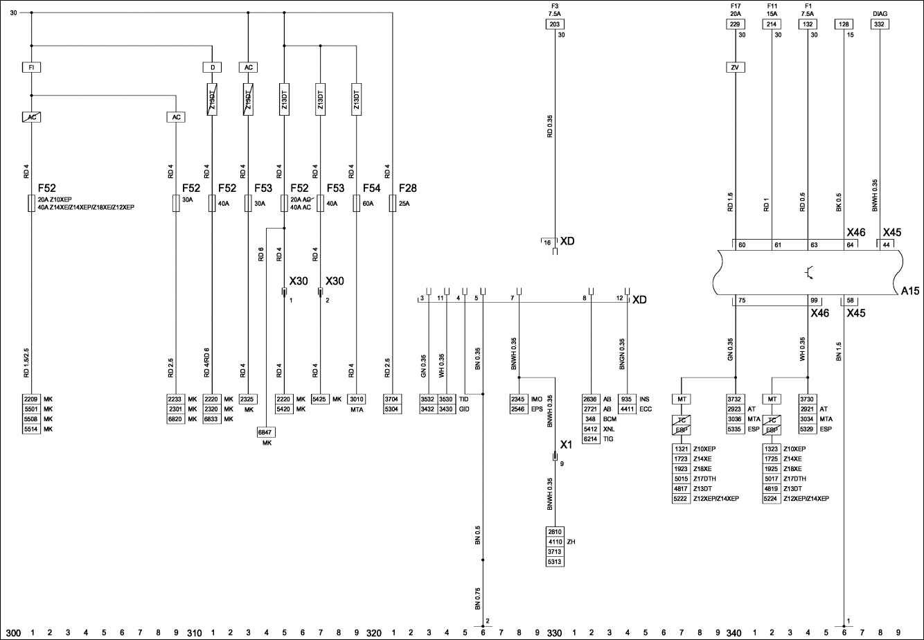 Продолжение сборника электросхем автомобиля Opel Corsa C. Здесь показаны схемы таких узлов: модуль управления кузовным оборудованием, рулевое управление с электроусилителем, система противоугонной сигнализации, антиблокировочная тормозная система и регулирование тягового усилия, центральное управление дверными замками и другие. Первую часть схем Opel Corsa смотрите здесь.
