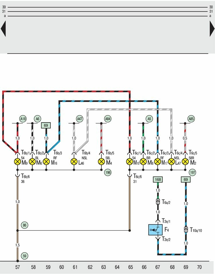 59 – точка соединения на "массу" вблизи от левого заднего габаритного фонаря;