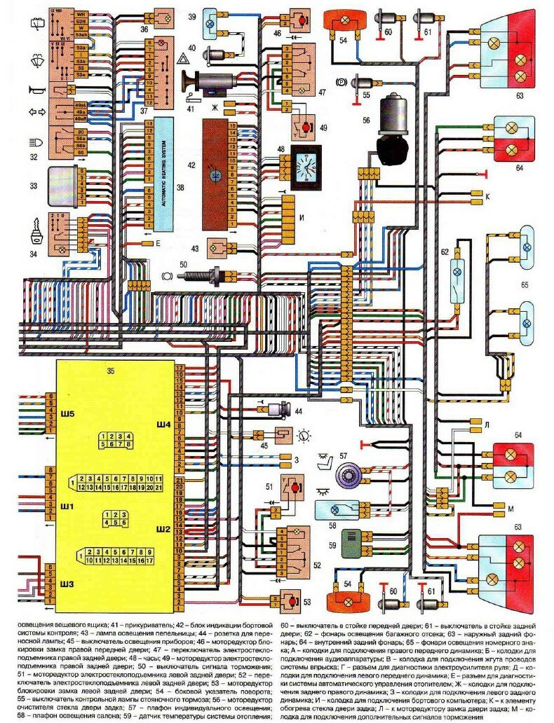 1. блок-фара; 2. датчики износа передних тормозных колодок; 3. датчик включения электродвигателя вентилятора; 4. электродвигатель вентилятора системы охлаждения двигателя; 5. звуковой сигнал; 6. генератор: 7. датчик уровня масла; 8. блок управления электромагнитным клапаном карбюратора; 9. контроллер отопителя; 10. выключатель клапана рециркуляции; 11. лампа подсветки рычагов управления отопителем; 12. коммутатор; 13. концевой выключатель карбюратора; 14. датчик контрольной лампы давления масла; 15. свечи зажигания; 16. электромагнитный клапан карбюратора; 17. датчик указателя температуры охлаждающей жидкости; 18. датчик-распределитель зажигания; 19. катушка зажигания; 20. стартер ВАЗ-2111; 21. электродвигатель вентилятора отопителя; 22. дополнительный резистор электродвигателя отопителя; 23. датчик скорости; 24. выключатель света заднего хода; 25. микромоторедуктор привода заслонки отопителя; 26. клапан рециркуляции; 27. датчик уровня тормозной жидкости; 28. колодки для подключения электродвигателя омывателя заднего стекла; 29. аккумуляторная батарея; 30. электродвигатель смывателя ветрового стекла; 31. датчик уровня омывающей жидкости; 32. датчик уровня охлаждающей жидкости; 33. моторедуктор очистителя ветрового стекла; 34. монтажный блок: 35. колодки для подключения жгута предупредительного света; 36. переключатель наружного освещения; 37. комбинация приборов; 38. выключатель заднего противотуманного света; 39. контрольная лампа противотуманного света; 40. контрольная лампа обогрева заднего стекла; 41. часы; 42. выключатель обогрева заднего стекла; 43. подрулевой переключатель; 44. колодка для переключения проводов при установке блок-фар другого типа; 45. регулятор освещения приборов; 46. выключатель зажигания; 47. колодки для подключения жгута проводов очистителей фар; 48. розетка для переносной лампы; 49. плафон индивидуального освещения салона; 50. выключатель стоп-сигнала; 51. плафон освещения салона; 52. блок бортовой системы контроля; 53. датчик указателя уровня топлива; 54. выключатель аварийной сигнализации ВАЗ-2111; 55. датчик ремня безопасности водителя; 56. прикуриватель; 57. лампа подсветки пепельницы; 58. выключатель лампы освещения вещевого ящика; 59. колодка для подключения бортового компьютера; 60. лампа освещения вещевого ящика; 61. боковые указатели поворота; 62. выключатели в стойках передних дверей; 63. выключатели в стойках задних дверей; 64. выключатель контрольной лампы стояночного тормоза; 65. фонарь освещения багажника; 66. датчик температуры для системы отопления; 67. наружные задние фонари; 68. внутренние задние фонари; 69. фонари освещения номерного знака; 70. элемент обогрева заднего стекла; 71. колодка для подключения дополнительного стоп-сигнала ВАЗ 2111.